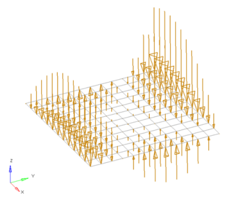 Figure 11. Flat Plate with a Linear Function for an Applied Force Magnitude = 20 – (5*x+2*y). The flat plate is 20 x 20 units, lying in the X-Y plane with the origin at the center.