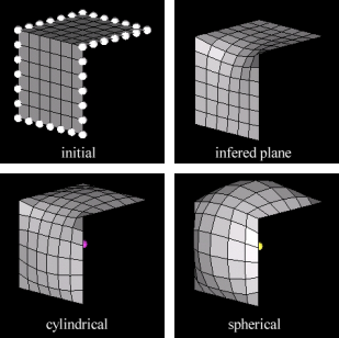 Figure 4 shows a mesh that has been morphed to match a surface interpolated from the nodes around its perimeter. The effects of the different shapes for the form of the interpolation can be seen clearly with the shapes ending up looking more like the form of the interpolation selected in each case. However, in all the cases, the interpolated surface fits through the control points.