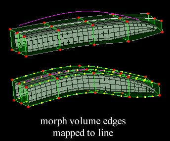 In Figure 3, the highlighted morph volume edges are mapped to the line while the dimmed edges are selected as follower edges. The highlighted edges are mapped directly to the line while the follower edges are given a similar morphing.