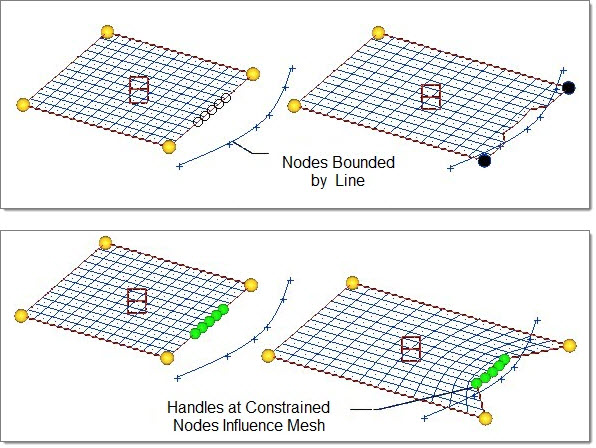 When a constraint to a line, plane, surface, elements, or an equation is applied, the nodes will be moved to that feature and the node movement will be stored as a morph that can be undone and redone. However, undoing a morph that occurred as part of constraining nodes will not remove the constraint. To remove a constraint after it has been applied, you will need to do one of the following: click reject, use the release feature on the release nodes subpanel, or delete the constraint (via the delete panel).