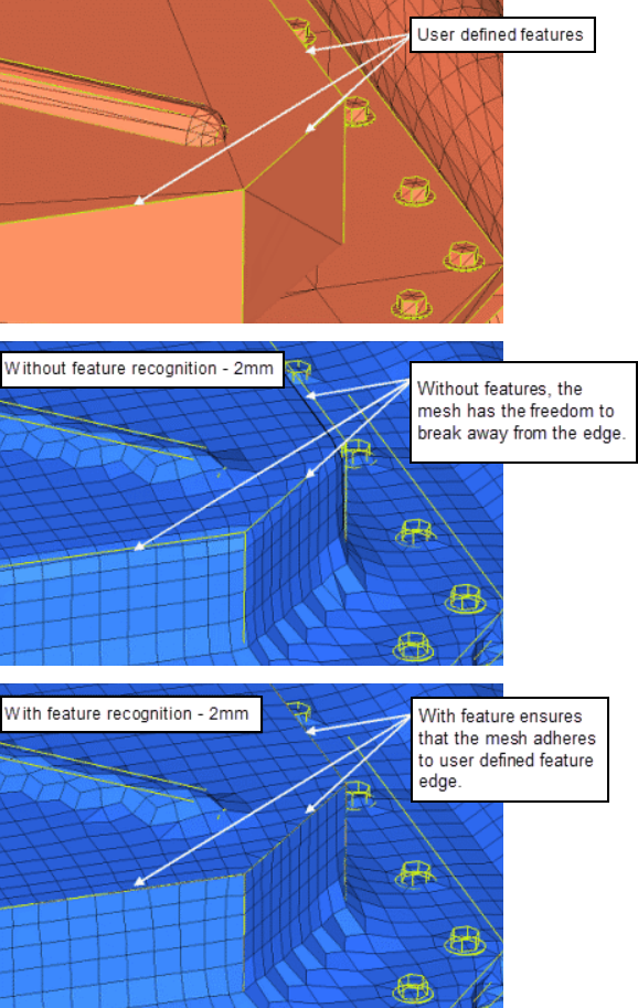 features Select feature lines on the model that must be retained. When meshed, elements will not cross over these lines.