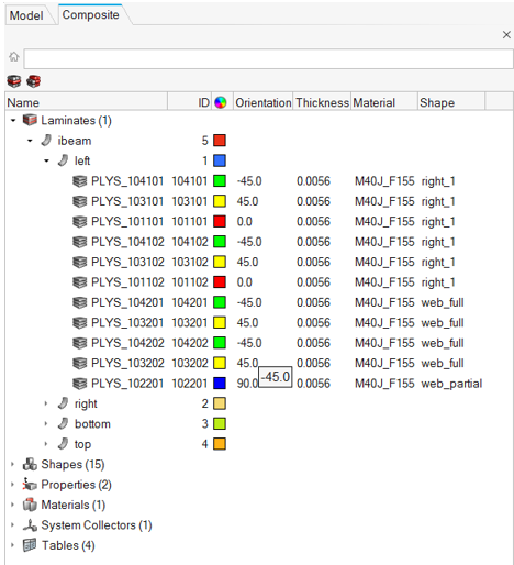 The Composite Browser consolidates entities and tools used in ply-based models. Ply-based models can be created, edited, and reviewed from within the Composite Browser. Additionally, composite stress toolbox functionality (like ABD matrix calculation) is provided in the context menu of relevant entities.