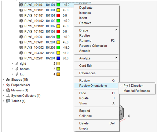 - Material Reference – Displays the x, y and z axes of the material reference orientation. This is the direction which ply orientations rotate from.