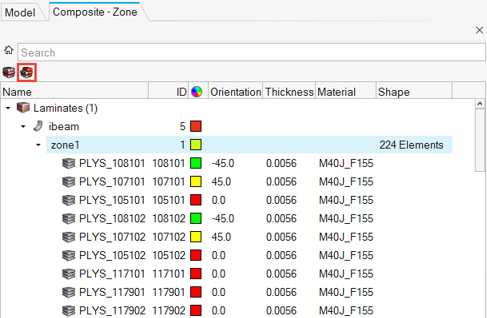 - The top pane contains a hierarchical view of either ply-based, or zone-based composite data.