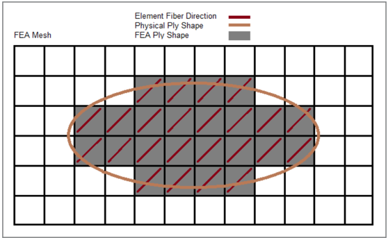 The shape (area) of an FEA ply is defined by selecting elements that most closely represent the complex shape of a physical ply. Typically, if an element's centroid exists within the bounds of the physical ply shape, that element is considered part of the FEA ply shape. The corresponding FEA ply shape is defined by the gray shaded elements of the associated FEA mesh.