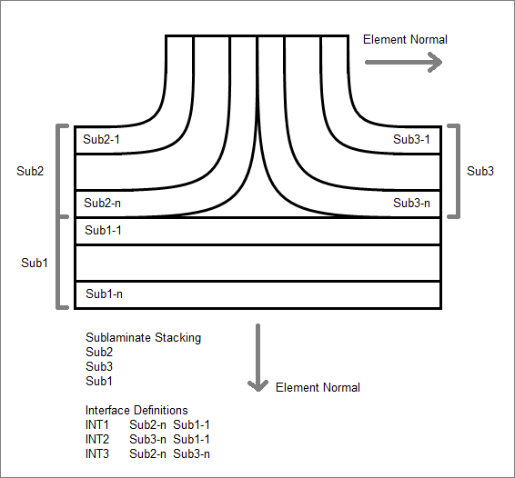 Interface laminates stack sublaminates. The stack direction for the sublaminates of an interface laminate is in the direction of the element's normal. The exact stacking sequence of the plies of the sublaminates is defined by the interface definitions within an interface laminate. An interface definition defines which surface plies of two sublaminates touch, or interface, with each other. Each sublaminate stacked within an interface laminate must have at least one interface definition.