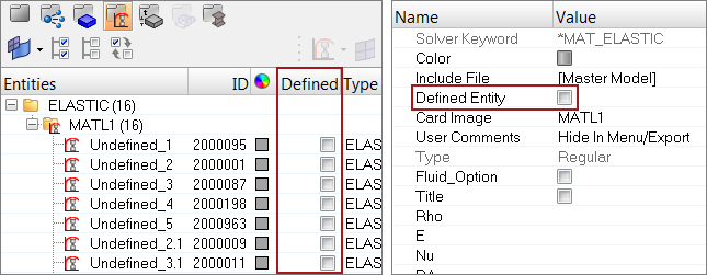 The defined state of an entity is indicated in the Model Browser, Defined column (Property and Material entity views), or in the Property Editor, Defined Entity field. An active checkbox indicates an entity is defined, whereas an inactive checkbox indicates an entity is undefined.