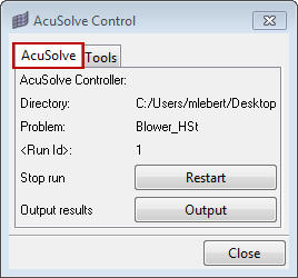 The tool integrates the mesh export and the AcuSolve job run. The submitted job can also be controlled from Engineering Solutions.