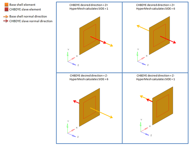 For CHBDYE secondary on 2D shell elements, HyperMesh will automatically assign a SIDE parameter value of 1 (top) or 6 (bottom), depending on CHBDYE normal direction. Use the Normals panel (Tool page) to change CHBDYE normal direction.
