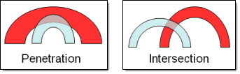 Penetration is defined as the overlap of the material thickness of shell elements, while intersection is defined as