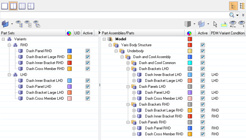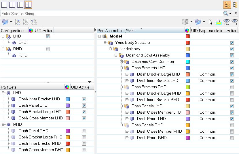 - If all parts and part sets that are unique are organized in a configuration, enable the LHD configuration’s associated checkbox in the Active column of the Configuration view.