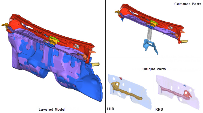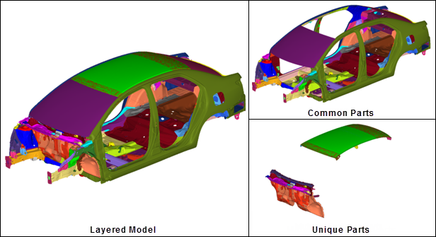 All common and unique parts that appear in all configurations for a given subsystem are stored in a single HyperMesh binary file, known as a Layered Model. In a Layered Model, common parts are active in all configurations. Unique parts are active only in a specific configuration. You must deactivate unique parts not appearing in a configuration.
