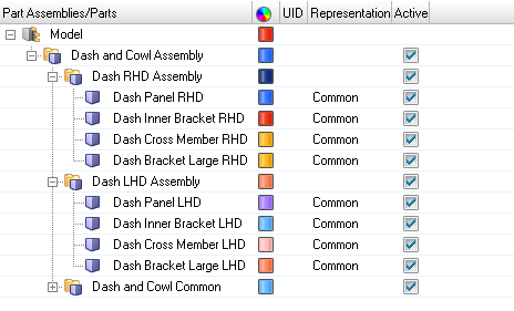 - If all unique parts are nested in a single part assembly, clear the Active column for Dash RHD Assembly.