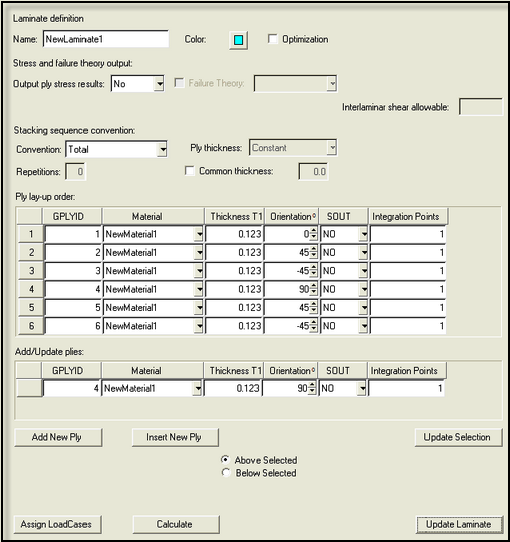 For laminates, the Define/Edit pane allows the laminate name, HyperMesh entity color, stacking sequence convention, and the ply lay-up order to be edited. In addition, HLS loadcases may be selected (through the Assign LoadCases button) and solved (through the Calculate button) for the current laminate. This is for all supported user profiles and laminate sub-types.