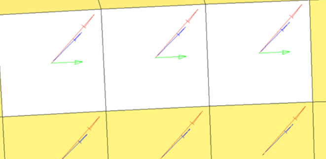 Figure 3. . The green arrows show the material X direction. The blue arrow shows the ply 5 fiber direction without drape. The red arrows shows ply 5 fiber direction with drape.