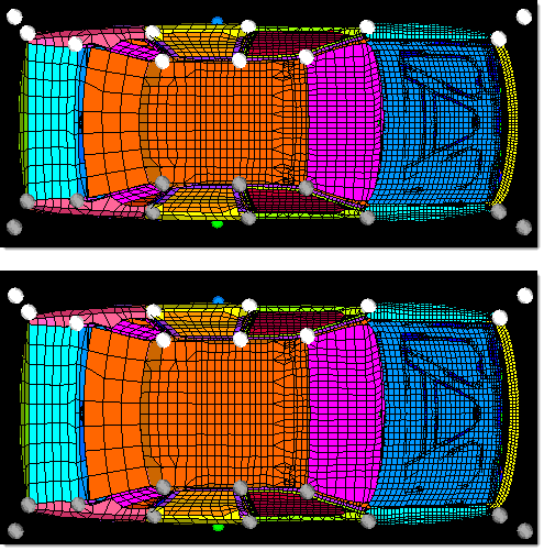 Figure 1. Morph by Altering Distance between Two Nodes. The width of the car is found by placing node a (green dot) on the right hand door and node b (blue dot) on the left hand door. The handles on the right side of the model are selected as followers for node a and the handles on the left side of the model are selected as followers for node b. The distance is changed and the model morphs.