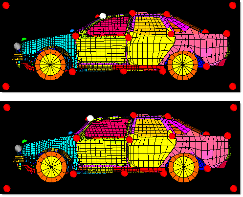 Figure 2. Morph by Altering Angle Formed by Three Nodes. The slope of the windshield is altered by defining an angle using three nodes, green, blue, and red, selecting two handles at the front of the car as followers for node a (green), and selecting two handles on either side of the windshield as followers for node b (red node). The angle is changed from 160 degrees to 150 degrees. Note that the handles on either side of the windshield were constrained to move along the x-axis (front to back) thus maintaining the height of the roof.