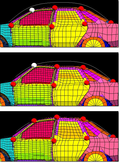 Figure 1. Morph to Profile Line. In the top frame, the global handles on either side of top of the windshield are selected. In the middle frame they are interactively moved upwards along a vector to a point matching with the profile line. In the bottom frame the process has been repeated for the other handles on the roof. The result is a morphed vehicle model that closely matches the profile line.