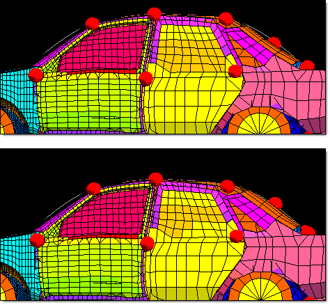 Figure 2. Morph to Profile Line. A handle is added to the center of the rear windshield and is moved to better match the profile line. Handles may always be added or deleted from a model without affecting the current morphed state of the model. However, any shapes saved as handle perturbations may not yield the same morphed shape after handles have been added or deleted. If you intend to add or delete handles in your model, save your shapes as node perturbations. HyperMorph will give you the option of converting existing shapes from handle perturbations to node perturbations automatically after you add, edit, or delete any morphing entities.