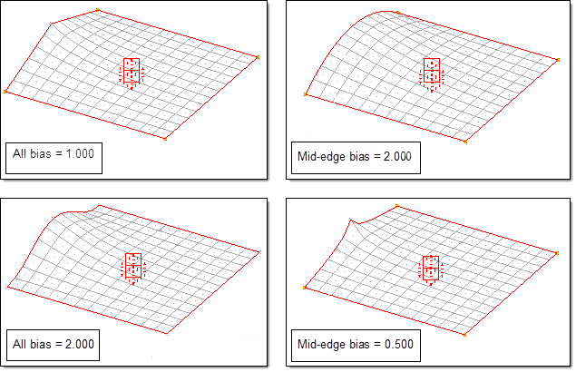 Figure 1. Biasing for a 2D Domain. The model at the upper left has all five handles with the default biasing value of 1.000. The model at the upper right shows the four corner handles with a biasing value of 1.000, and the mid-edge handle with a biasing value of 2.000. The model at the lower left has all five handles with the default biasing value of 2.000. The model at the upper right shows the four corner handles with a biasing value of 1.000 and the mid-edge handle with a biasing value of 0.500.