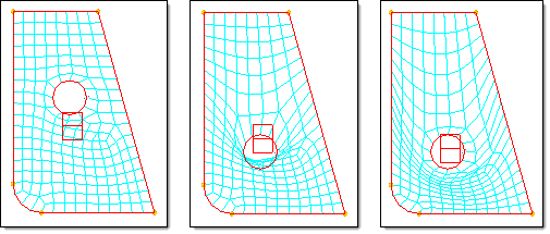 Figure 2. Biasing to Reduce Mesh Distortion. When the hole is moved downward with a biasing factor of 1.000 for the handle at the hole, the mesh folds over due to the influences of the other handles (middle frame). When the biasing value of the handle at the hole is increased to 3.000, the mesh unfolds (right frame).
