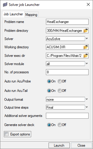 Prior to running through this tutorial, copy HyperMesh_tutorial_inputs.zip from <Altair_installation_directory>\hwcfdsolvers\acusolve\win64\model_files\tutorials\AcuSolve to a local directory. Extract ACU-T3300_HeatExchanger.hm from HyperMesh_tutorial_inputs.zip.