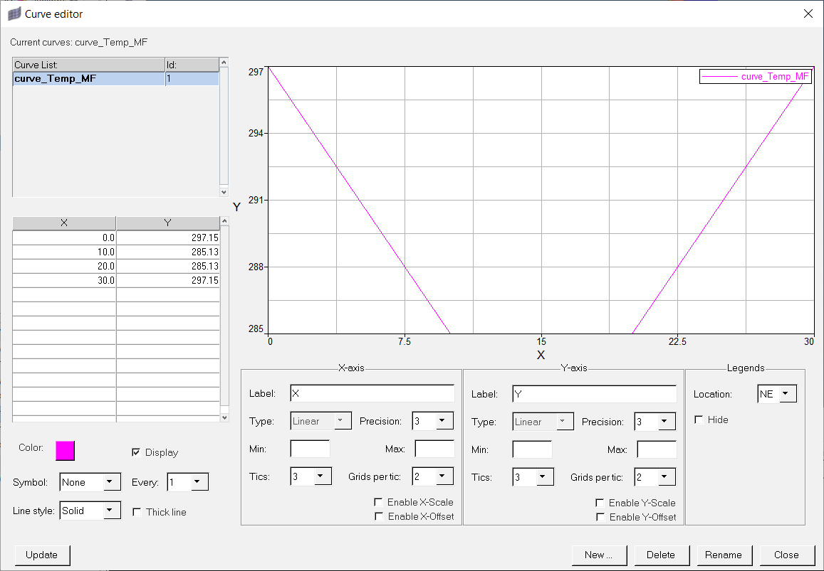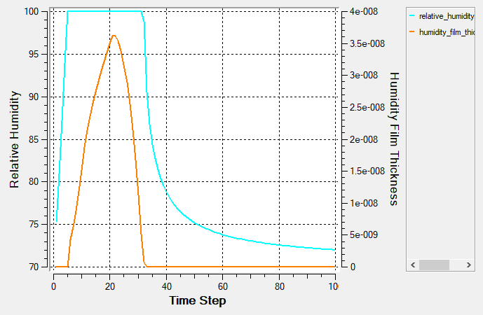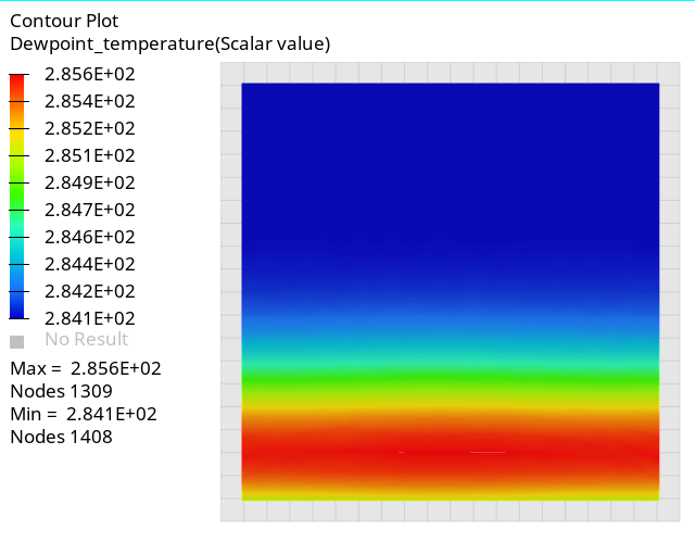 From the above plot, we can see that the Air volume initial temperature is set to 297.15 K. The Bottom Wall temperature drops to 285.13 K over 1 sec, maintains 285.13 K for 1 sec, and then rises back to 297.15 K over 1 sec. The dew point temperature of the air at 70% RH is 291.14 K and is reached at 0.5 and 2.5 sec. On the whole we can see that both condensation and evaporation occurs when the dew point temperature is reached, as explained above.