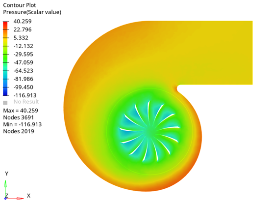 In this tutorial, you successfully learned how to set up a steady state simulation involving a rotating reference frame in a centrifugal blower. You started by importing the mesh and then once the case was set up, you generated a solution using AcuSolve. Then, you computed the pressure rise using AcuProbe and created a contour plot for pressure on a cut plane using HyperView.