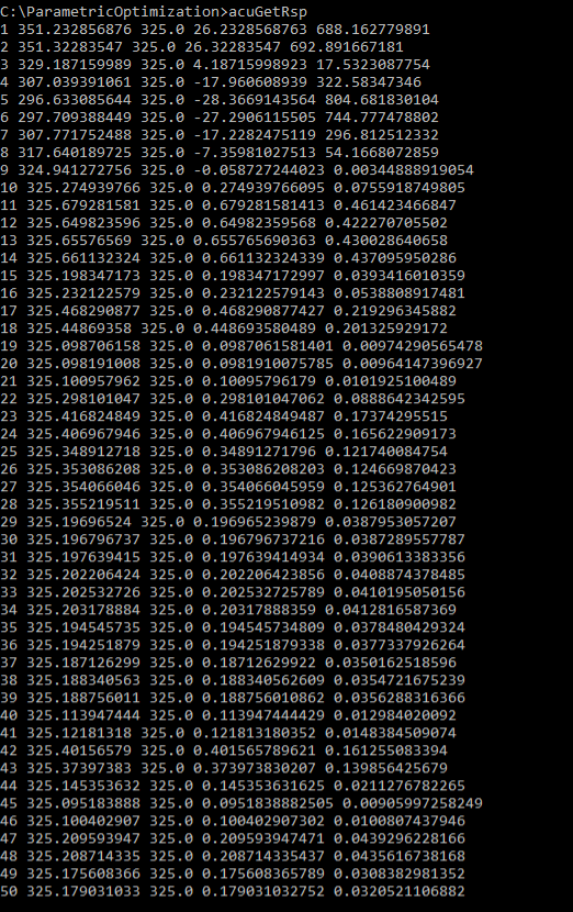 AcuSolve provides two post-processing utilities specific to optimization problems, AcuGetDv and AcuGetRsp. AcuGetDv provides the values of the design variables for all the cases included in the solution. AcuGetRsp provides the values of the response variables for all the cases included in the solution.