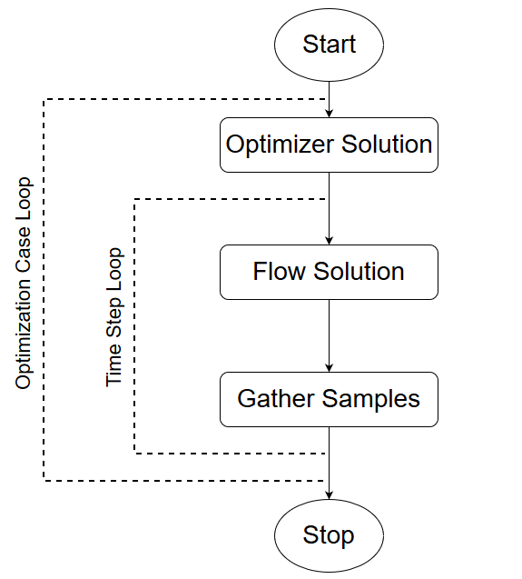 The design optimization may be considered as a sequence of cases, where each case first runs the optimizer and updates the design variables and then solves the flow equations for a number of time steps until convergence. Sample data is gathered at the end of each time step.