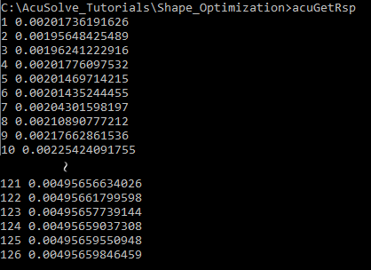 AcuSolve provides two post-processing utilities specific to optimization problems, AcuGetDv and AcuGetRsp. AcuGetDv provides the values of the design variables for all the cases included in the solution. AcuGetRsp provides the values of the response variables for all the cases included in the solution.