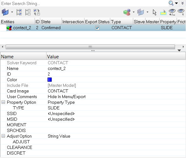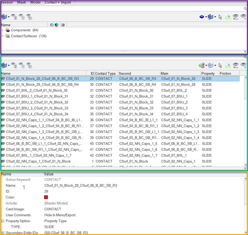 The Contact Browser lists every contact interface and surface within a HyperMesh session and organizes them into their respective folders. You can modify these contact interfaces and surfaces using the Entity Editor.