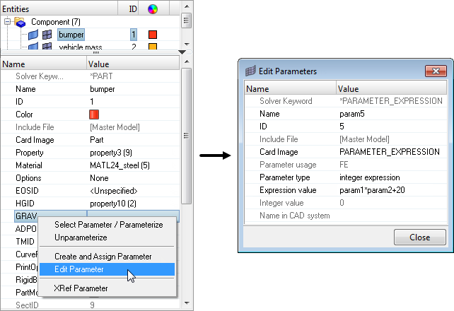 In the LS-DYNA, OptiStruct, and Radioss user profiles, certain entities can be defined with parameters in the Entity Editor.