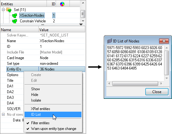 Sets can be generated for nodes, elements, components, assemblies, properties, materials, ellipsoids, multibody planes, multibody joints, and multibodies which contain entity IDs for that specific entity. In the Entity Editor, you can view an ID list for set entities. The entity IDs are compacted using ranges, and segregated using ID pools. If some of the IDs are unresolved, than they will be listed separately under Unresolved IDs.