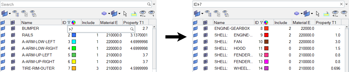 ID>=10 AND ID=<20 AND Name~Bpillar All entities that contain Bpillar in their name and have an ID greater than or equal to 10 and less than or equal to 20.