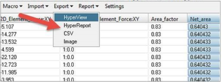 • Export HyperMesh and HyperView data to an Excel file for further post-processing and report generation.