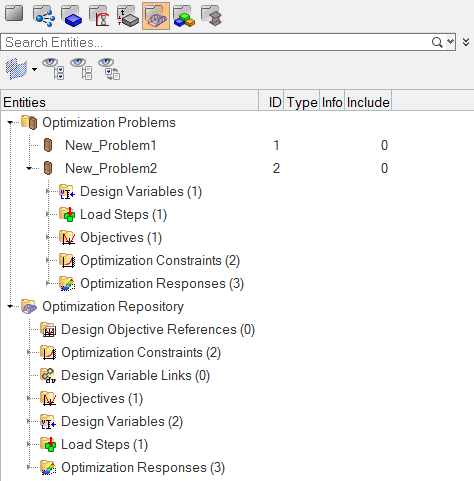 These entities include: Objectives, Objective References, Optimization Tables, Design Equations, Responses, Design Variables, Design Variable Relationships, Design Variable Links, Constraints, Loadsteps, Optimization Controls and Discrete Design Values.