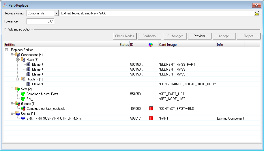 Multiple components and their corresponding entities can be replaced simultaneously using the Part Replacement tool.
