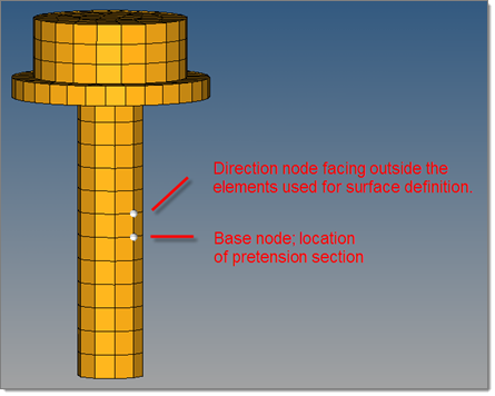 The tool then creates a surface (*SURFACE) cutting through the bolt at the location of the base node. It also creates a node in the surface plane, outside the bolt and not attached to the model. This node automatically gets an HM tag HMpre-tension_node so that it is easier to find.