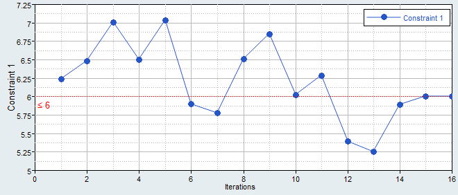 | Constraint label (value at percentile) | The estimated constraint value at the constrained CDF limit. | The reliability of design with respect to this constraint. |
