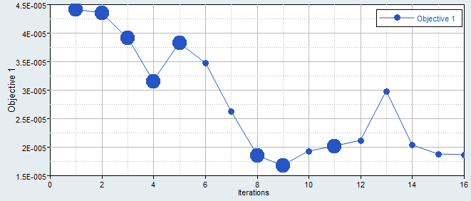 Plot the iteration history of a study's objectives, constraints, input variables and unused output responses in a 2D chart using the Iteration Plot tab.