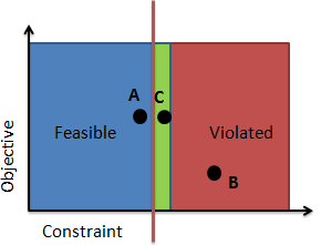 Figure 5. Violation Codes. A minimized objective versus an output response constrained to stay below a bound. Design A is feasible, design B is violated, and design C is acceptable. The plot exaggerates the size of the green zone for visualization, it is typically very small. - Best Iteration