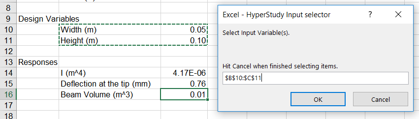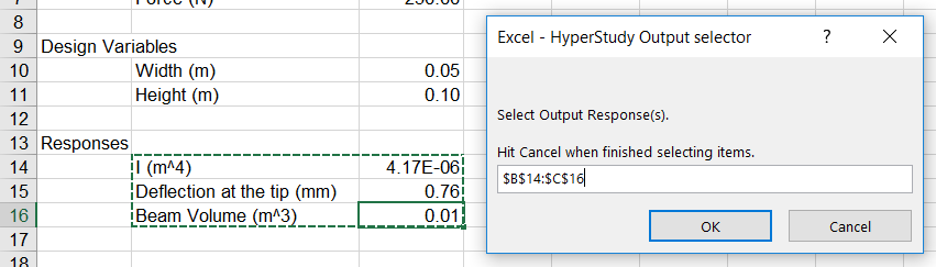 The selected cells display in the Excel - HyperStudy