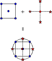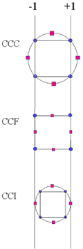 | Circumscribed | CCC | Designs are the original form of the central composite design. The star points are at some distance α from the center, based on the properties desired for the design and the number of factors in the design. The star points establish new extremes for the low and high settings for all factors. These designs have circular, spherical, or hyperspherical symmetry and require five levels for each variable. Augmenting an existing factorial or resolution V fractional factorial design with star points can produce this design. |