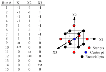 Central Composite Design contains an imbedded factorial or fractional factorial design with center points that are augmented with a group of `star points' that allow the estimation of curvature.