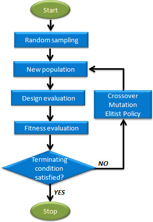 Genetic Algorithm starts with the creation of a population of designs (a generation). These designs are then ranked with respect to their fitness. Fitness is a measure of how good a design is and it is calculated as a function of constraint violation and objective function values. Selected designs are then reproduced through the application of genetic operators, typically crossover and mutation. The individuals that result from this process (the children) become members of the next generation. This process is repeated for many generations until the evolution of a population converges to the optimal solution.