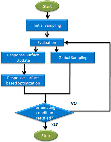 A response surface based approach. During each iteration, the response surface based optimization generates a few designs. Additional designs are generated globally to ensure a good balance on local search capability and global search capability. Response surface is adaptively updated with the newly generated designs to have a better fit of the model.