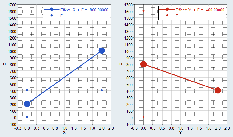 - When Y is at upper level, the mean output response is (401 + 401) / 2 = 401