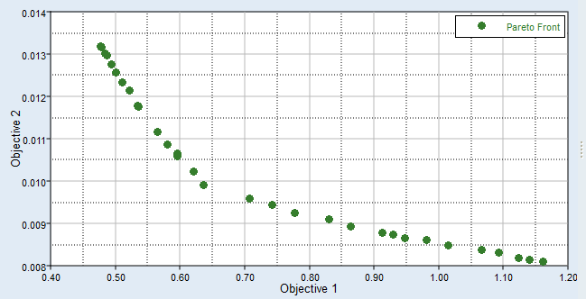 The Optima tab displays a plot of two different quantities. This is frequently done to plot multiple objectives against each other, which is known as a Pareto Front.