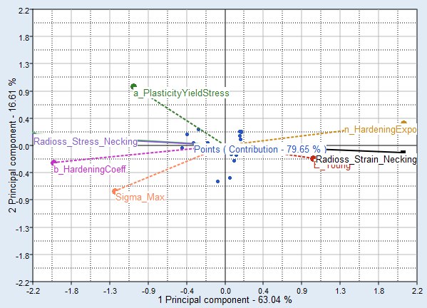 Data is represented as scatter points. Each input variable and output response in the biplot is represented by a line. The relative angle and the angle between lines can be interpreted to determine which are correlated. Lines that point in the same direction have strong correlations (positive or negative depending on whether the lines point in the same or opposite directions). The relative length of the lines also indicates a strong correlation.